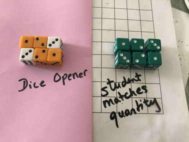 Use the dice opener slides. Start with just a section of the array and show students an arrangement of dice or dots or bingo chips or blocks. They make the same arrangement on their grid. The focus is matching the arrangement.